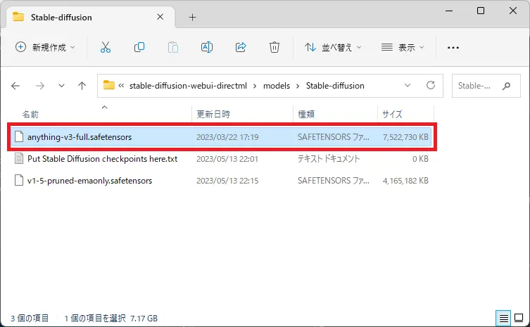 「anything-v3-full.safetensors」を選択します。