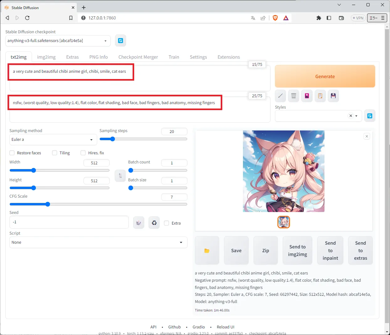 プロンプトとネガティブプロンプトを入力してGenerateをクリックします。